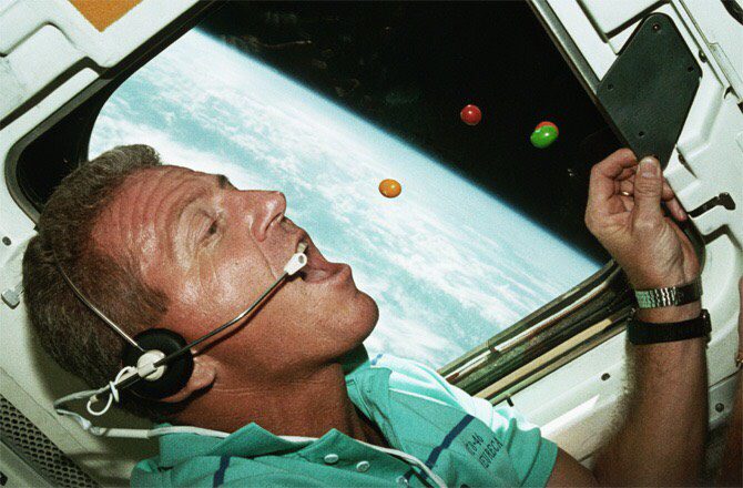 L'astronauta Loren Shiver nell'intento di divorare alcune M&M a gravità zero