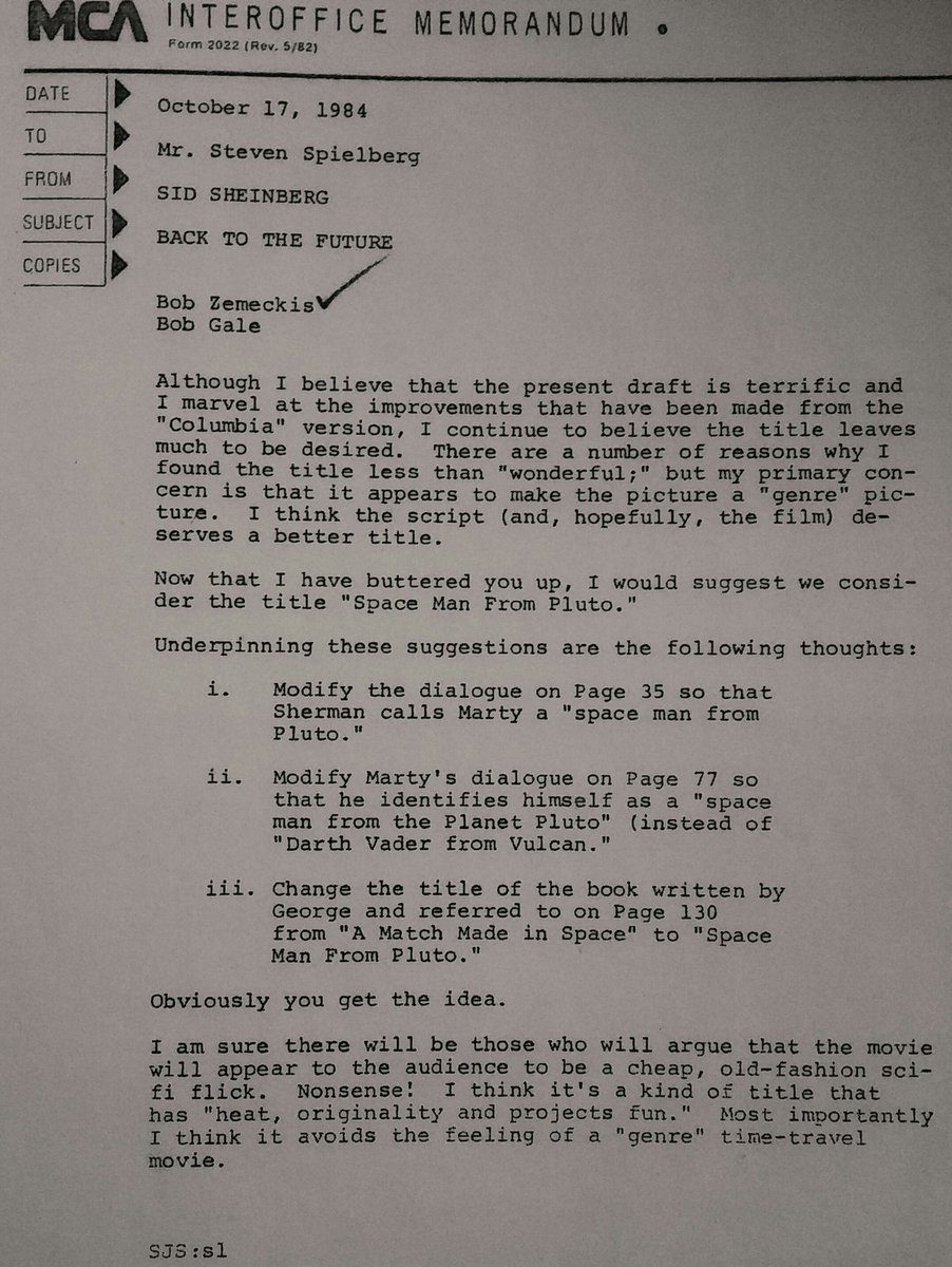 Il 28 agosto scorso il regista, sceneggiatore e direttore della fotografia William McCrabb ha pubblicato su Twitter la foto di un documento interno che nel 1984 Sid Sheinberg, che lavorava per la casa di produzione Universal Studios, inviò a Steven Spielberg, allora impegnato nella produzione di Ritorno al Futuro.